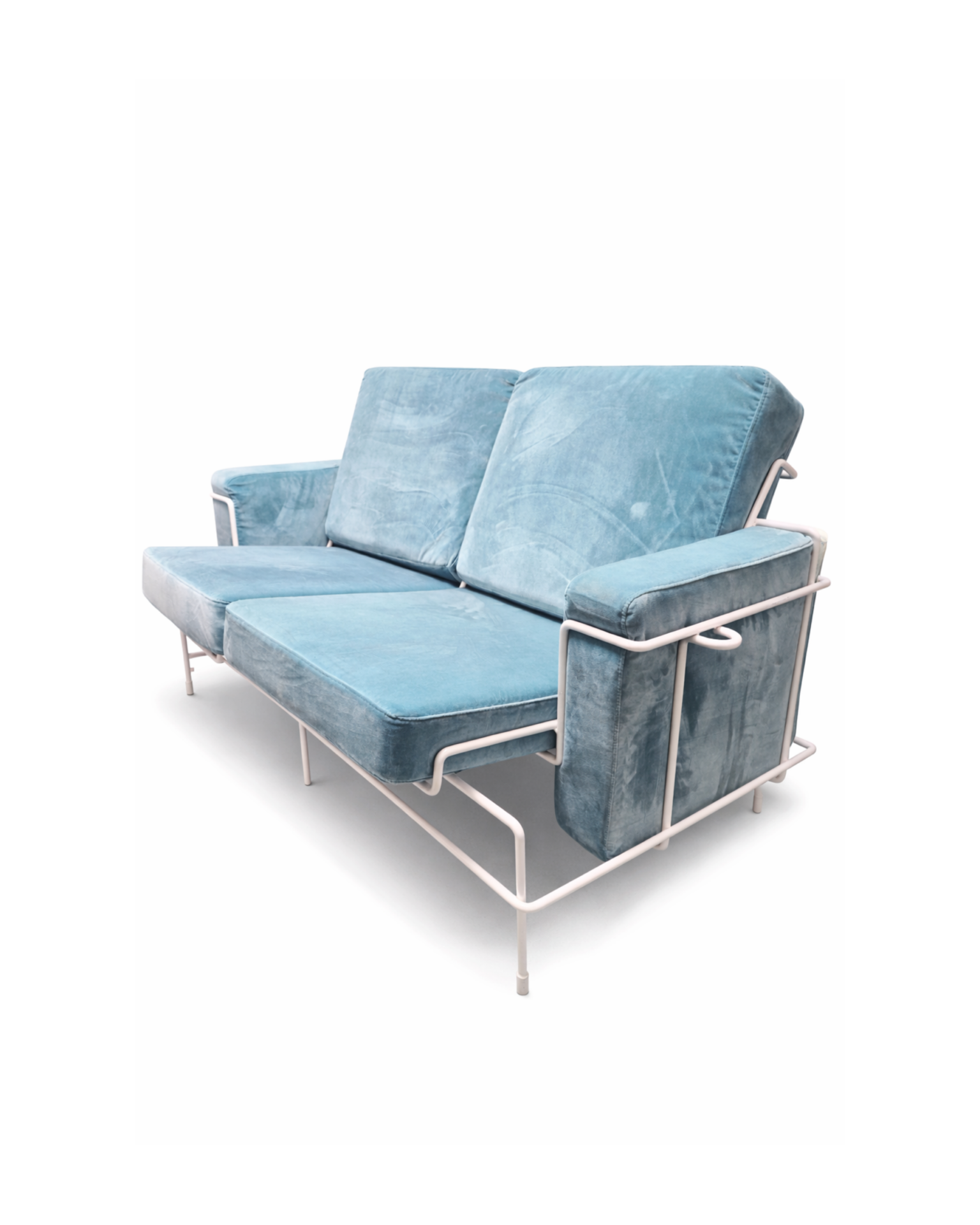 La structure en métal blanc apparent, signature de la collection Traffic, dessine une architecture fine et assumée. Elle contraste élégamment avec la générosité des coussins, créant un équilibre parfait entre rigueur industrielle et confort domestique.