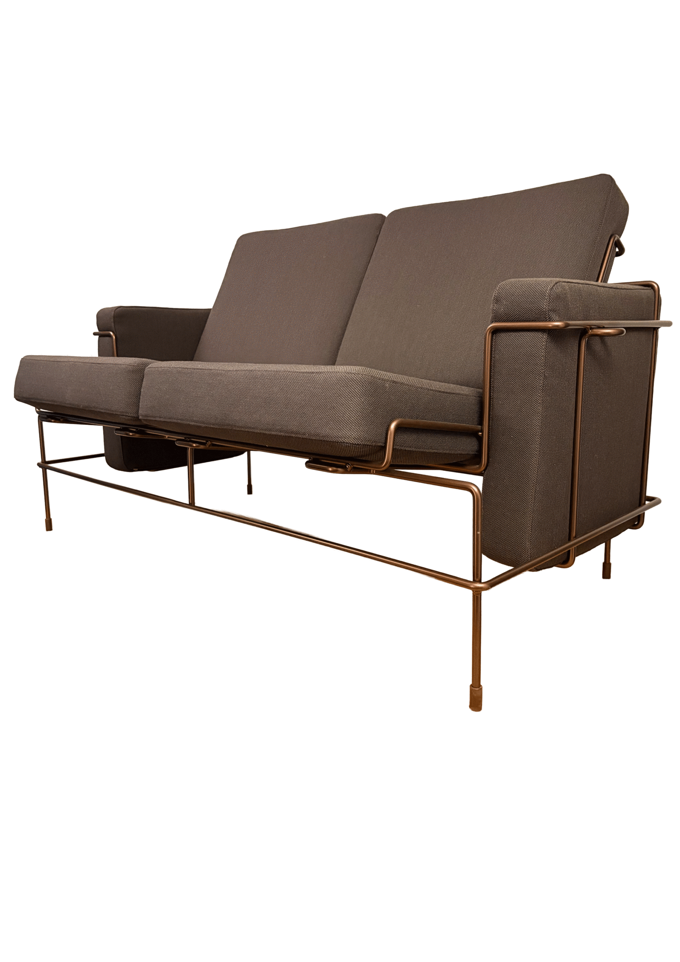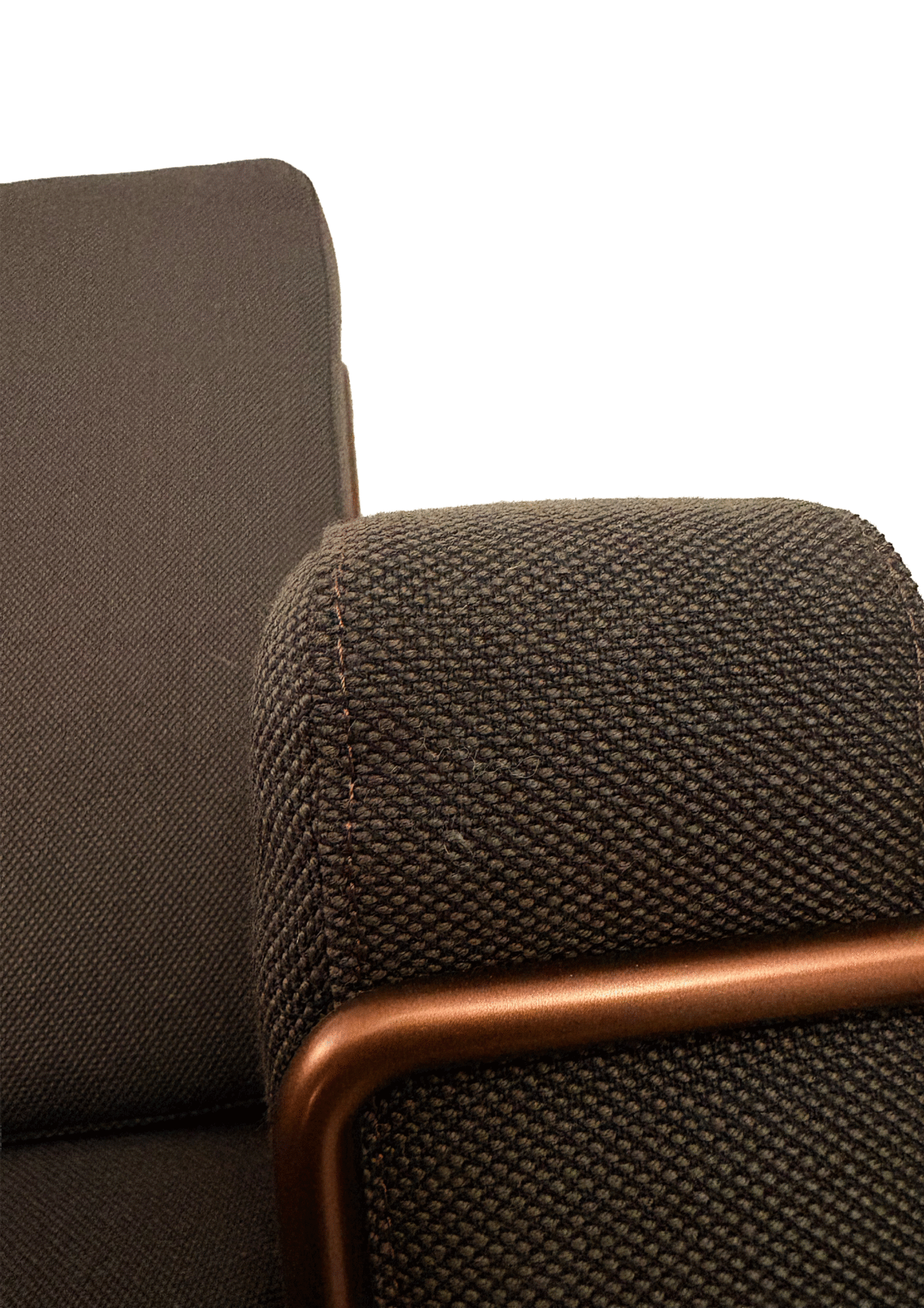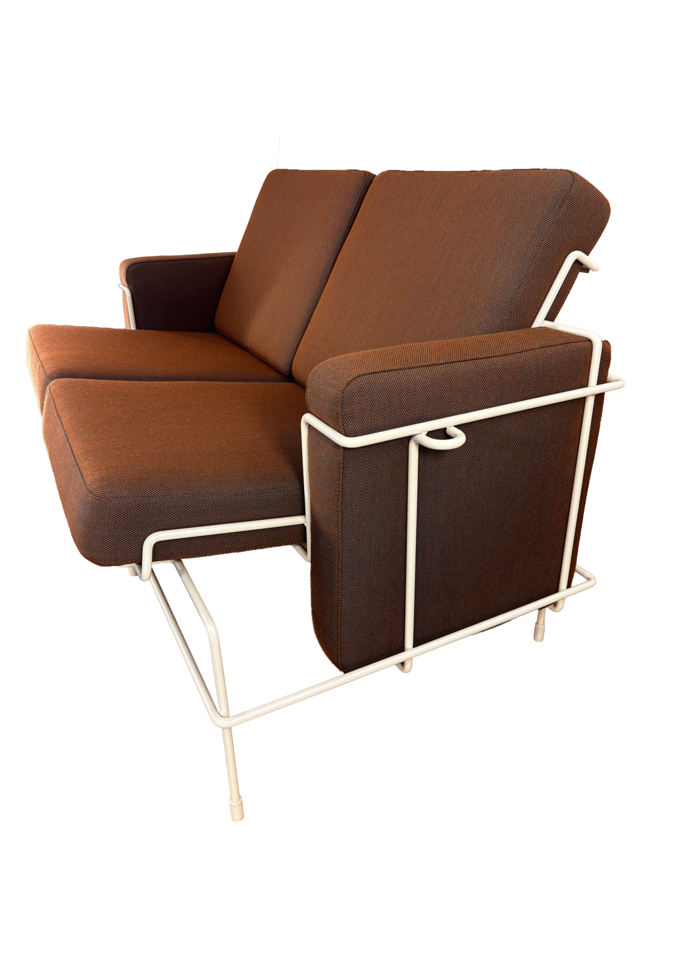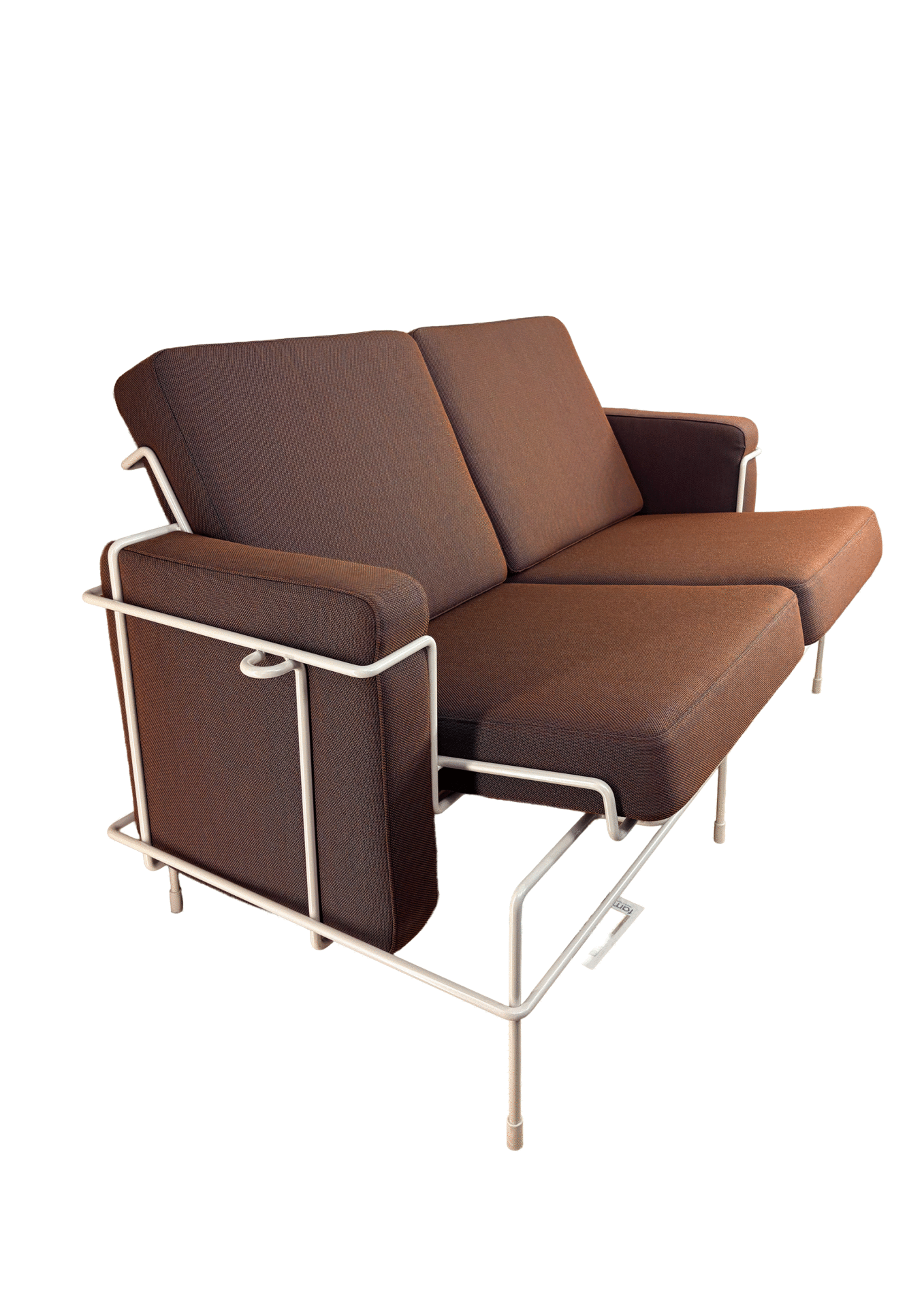 Structure en métal blanc apparent, lignes nettes, confort assumé. Le design intelligent, sans effet de mode.