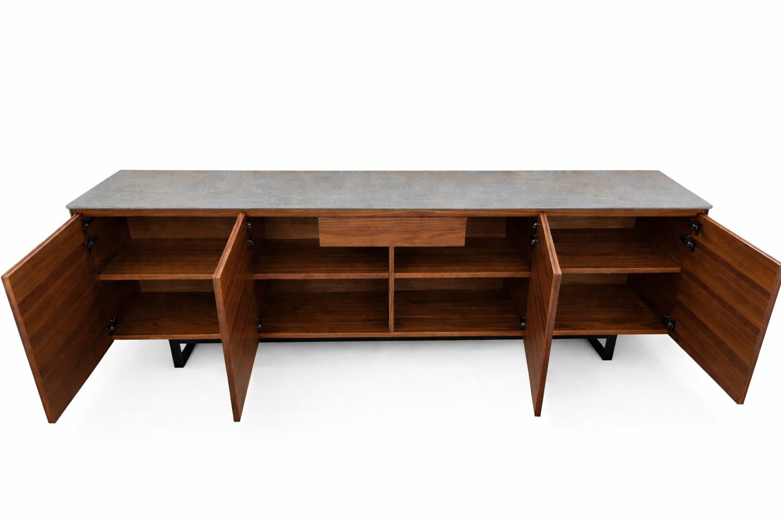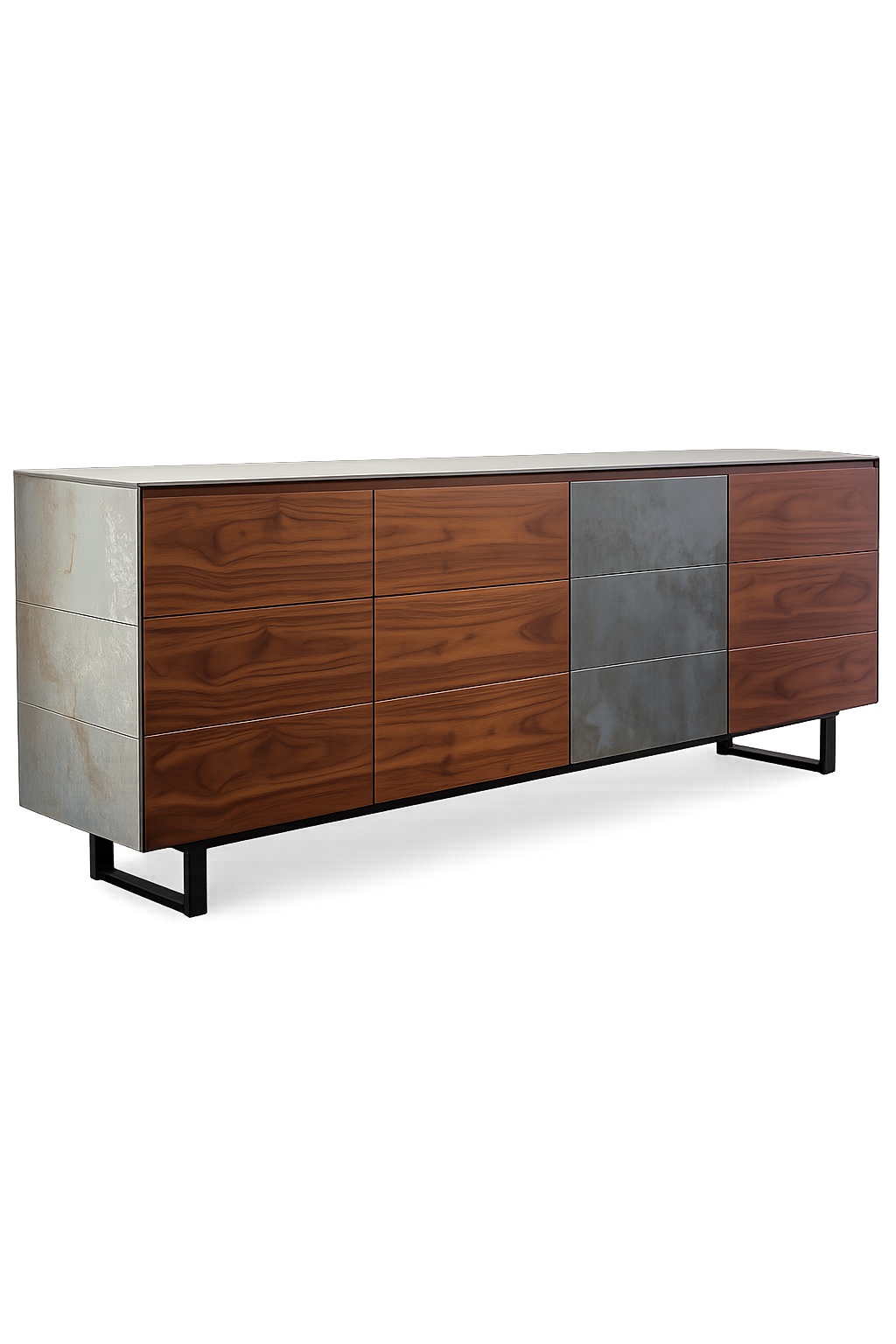 Dressoir au design contemporain associant bois naturel(noyer)et détails minéraux(céramique), aux lignes géométriques élégantes. Une pièce haut de gamme, graphique et fonctionnelle, idéale pour un intérieur moderne et raffiné.