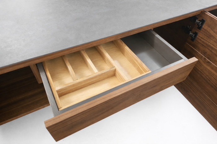 Les portes en noyer mettent en valeur un veinage naturel chaleureux, tandis que les côtés, le plateau supérieur ainsi qu’une porte centrale sont habillés d’une céramique gris bleuté, à l’aspect minéral raffiné et très résistante au quotidien.