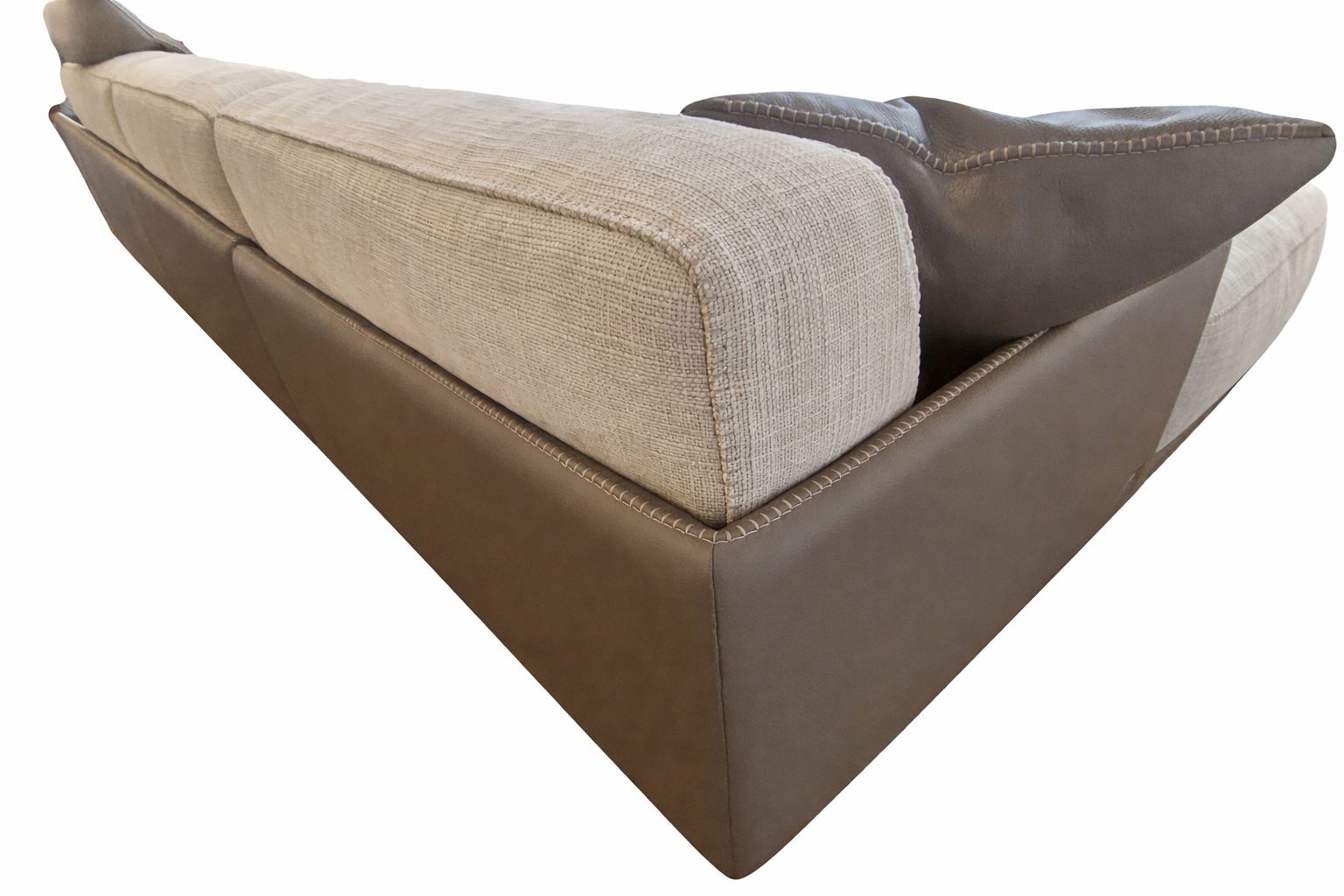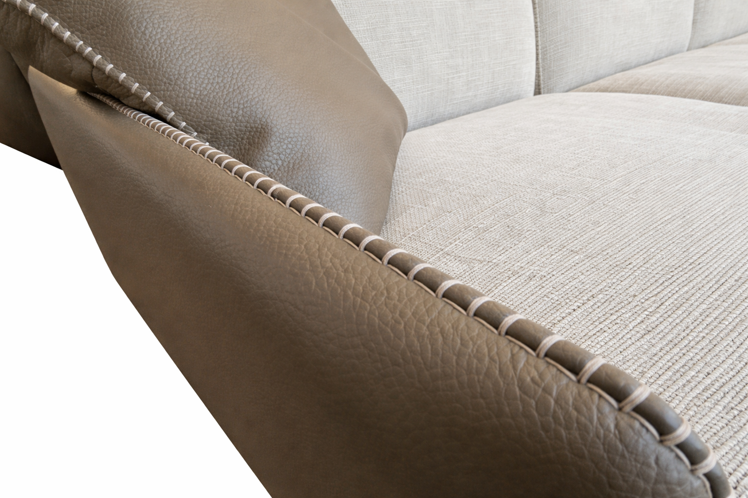 Canapé modulable haut de gamme associant un tissu beige texturé élégant à une structure en cuir taupe raffiné, offrant un confort généreux, des finitions soignées et une grande modularité grâce à ses éléments utilisables ensemble ou séparément.