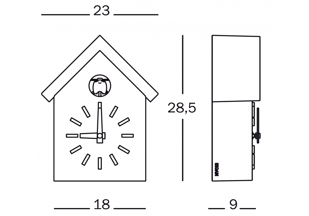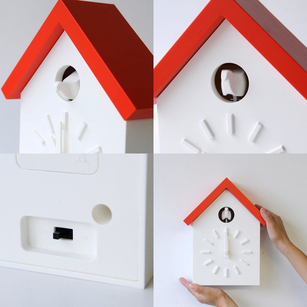 Elle présente un design minimaliste avec une maison blanche et un toit coloré orange. Chaque heure, un petit oiseau abstrait sort pour annoncer le temps ou le faire taire au choix. Une pièce décorative et fonctionnelle, idéale pour les intérieurs contemporains.