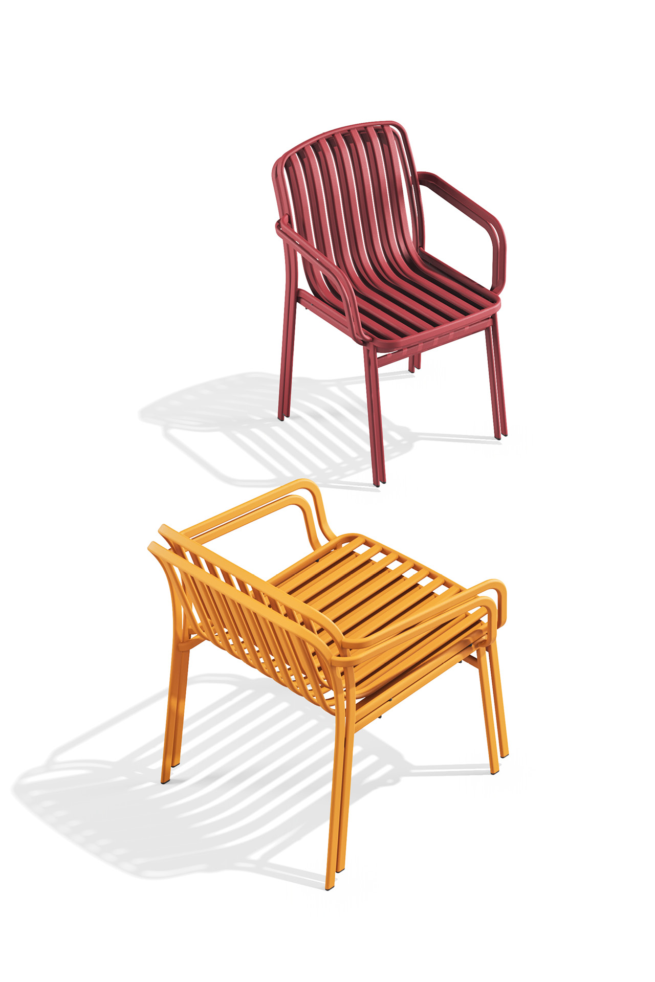 Kano, c’est bien plus qu’une simple chaise. C’est une famille complète de sièges et de tables unie par un motif structurel unique : ces lignes verticales caractéristiques qui créent un rythme graphique hypnotique. De la chaise à la dormeuse en passant par le fauteuil et la banquette, chaque pièce partage ce même ADN visuel qui confère à la collection force physique et cohérence esthétique. Un jeu subtil entre pleins et vides, solidité et légèreté, qui sublime autant une terrasse méditerranéenne qu’un intérieur urbain contemporain.