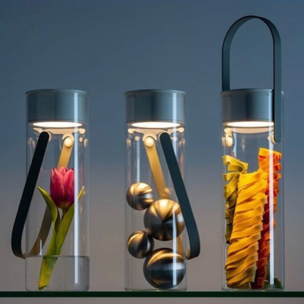 un objet lumineux hybride, pensé comme une lanterne contemporaine, un vase décoratif et un luminaire nomade.