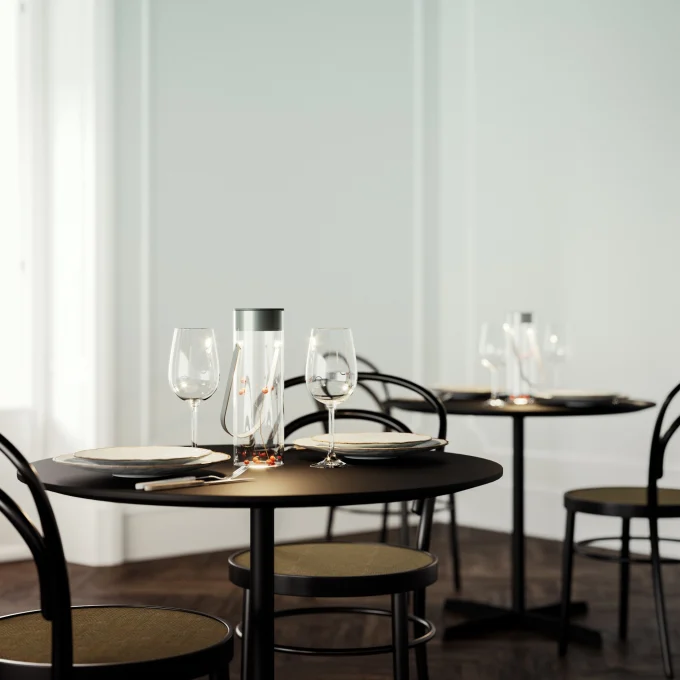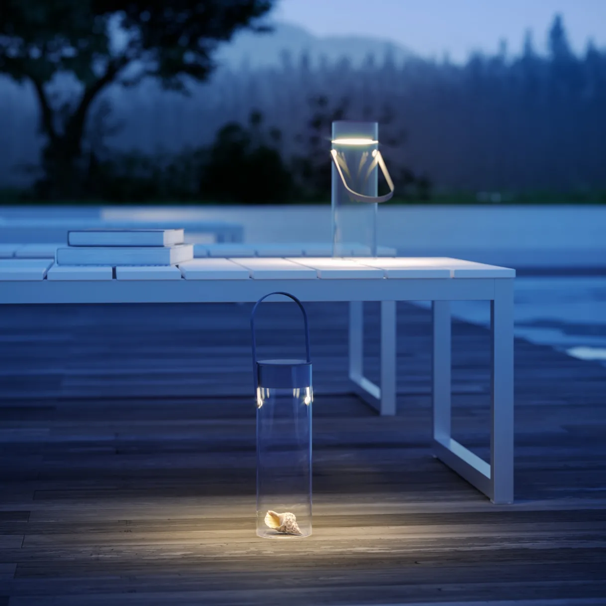 Une fois chargée, la lampe fonctionne sans fil et diffuse une lumière puissante et dimmable, idéale aussi bien pour créer une ambiance douce que pour éclairer plus généreusement une table ou une terrasse.