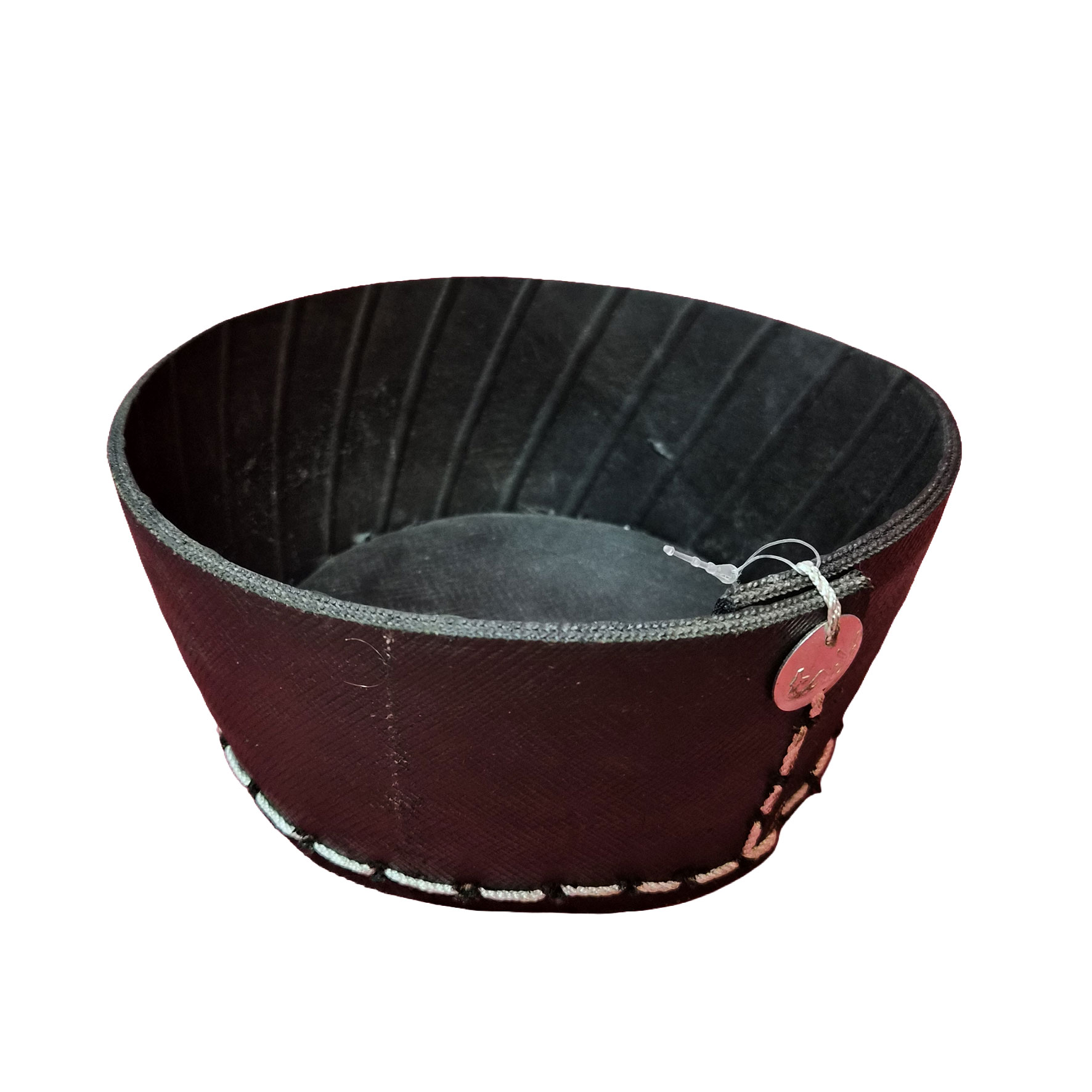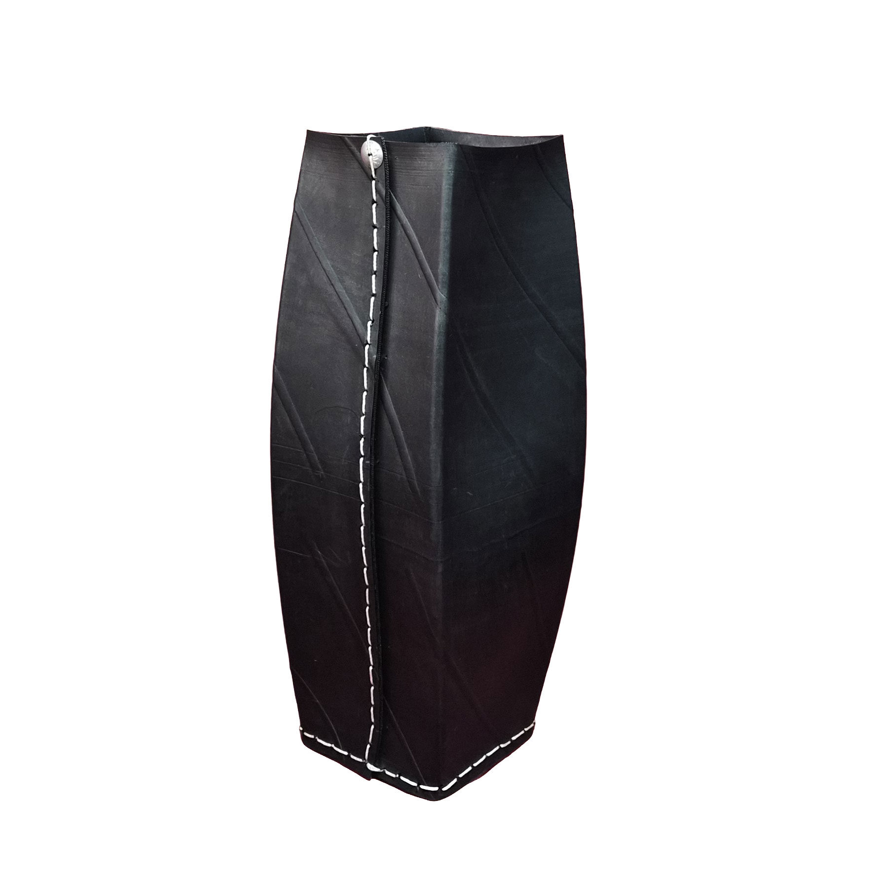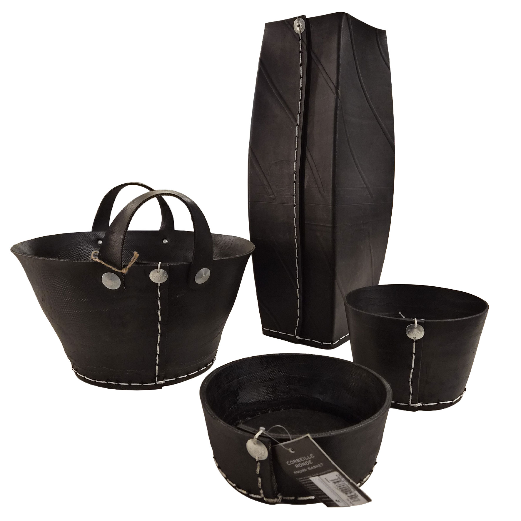 Fabriqués à partir de pneus recyclés, ces objets affichent une matière brute, texturée, presque sculpturale. Les surpiqûres apparentes et les détails métalliques renforcent leur caractère artisanal et affirmé. Chaque pièce porte en elle une seconde vie, transformée en élément décoratif durable et contemporain.